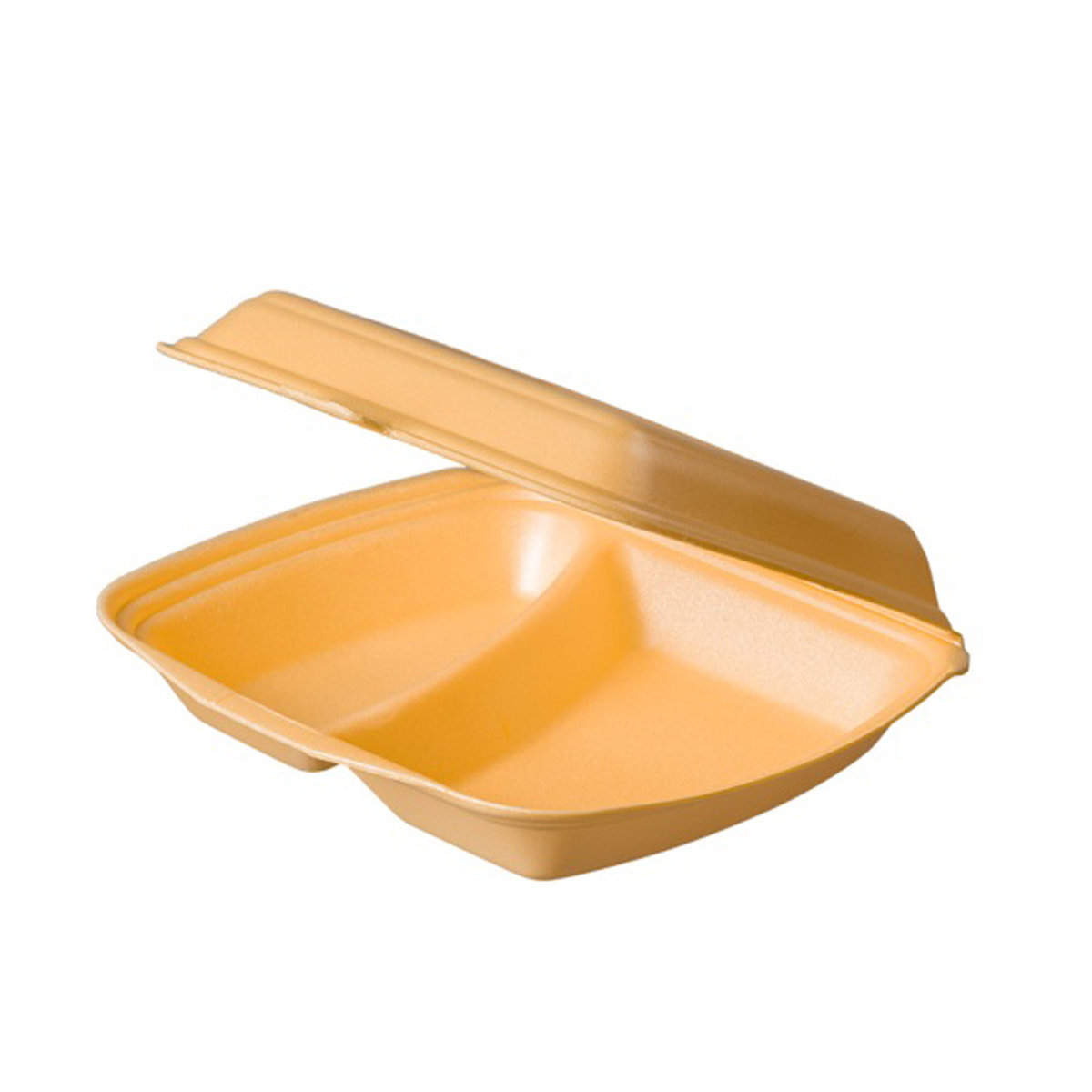 Envase de foam con 2 compartimentos, ideal para menús combinados, raciones y comida para llevar.